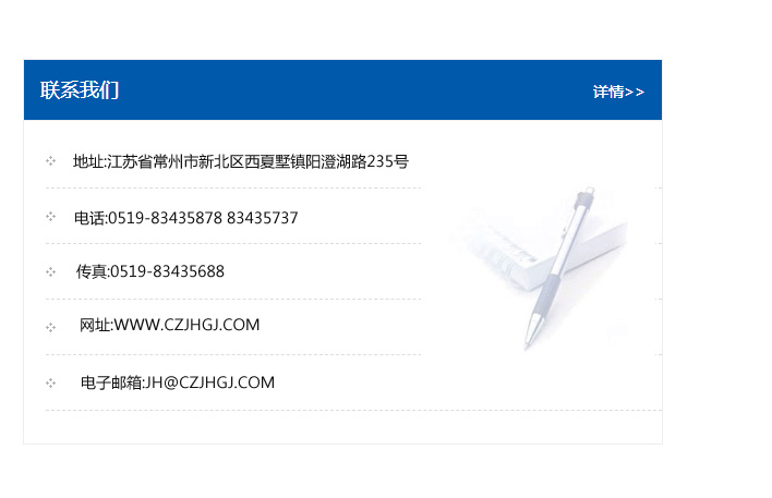 地址:常州市新北區友邦商務大廈1幢16、17層  電話:0519-85101652  傳真:0519-85112595  郵編:213022  網址:www.cz-jiayue_cn.gzhanyao.com  郵箱:xiajifengaa@163.com